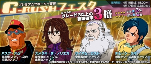 4月15日(金)からの3日間限定で開催される「G-RUSHフェスタ」では、グレード3以上のゴールドサポーター要請確率が通常の3倍にアップする。この機会に強力なサポーターを要請して、ジオラマベースや部隊編成を強化しよう。