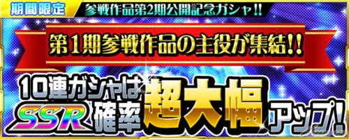 開催中の「参戦作品第2期公開記念ガシャ」には第1期参戦作品の主役31名集結しており、10連はSSRの確率が大幅にアップしている。先日開催された「重大発表記念Twitterキャンペーン」の報酬イベントチケットを持っていると、SSR確定版を引くことができる。