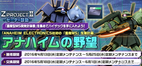 本イベントでは、戦闘報酬やイベントを通して獲得可能な「量産型MS開発計画書」を集めることで、『機動戦士Ζガンダム』に登場する量産型MS「ハイザック」の設計図や要請書と交換することができる。
