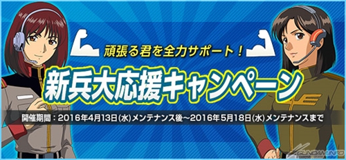 5月18日(水)定期メンテナンスまでのキャンペーン期間中に「伍長」へ昇格すると、地球連邦軍では「百式」、ジオンでは「キュベレイ」の、既に強化されている強力なレンタル機体の「要請書」とデッキコストを拡張することができる「デッキコスト拡張チケット」がプレゼントされる。さらに、伍長昇格後もパイロットまたは指揮官として、大規模戦合計50戦は獲得できるゲーム通貨「GP」が3倍になる。
