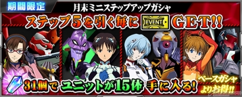 SSR ยูนิทจาก『EVANGELION:1.0 YOU ARE (NOT) ALONE』และ『EVANGELION:2.0 YOU CAN (NOT) ADVANCE.』มาแล้วในอีเว้นท์「Mini Step Gacha ประจำช่วงสิ้นเดือน」โดยในครั้งแรกสามารถใช้ Omega Crytal 1 ก้อนในการกด และสามารถกดด้วย Omega Crytal พร้อมกัน 31 ก้อน เพื่อสุ่มรับ 15 ตัว และยังมีโอกาสรับคูปองพิเศษของอีเว้นท์ได้อีกด้วย รีบมาเลยก่อน วันอังคารที่ 31 พ.ค. นี้ เวลา 15:59 น.