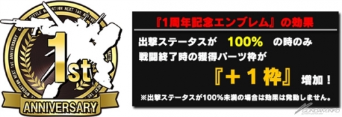 Emblemที่ระลึก1ปี1 (周年記念エンブレム) เป็น Emblemที่มีผลพิเศษ เมื่อสภาพพร้อมออกรบ100% พาร์ทที่ได้รางวัลจากการรบจะเพิ่มขึ้น+1