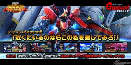 褒賞として、「サザビー」の開発・強化、先行入手機体「νガンダム」の開発ができるランクマッチSeason6「近くにいるのならこの私を感じてみろ!」開催。あわせて「サザビー・νガンダム」の 紹介映像も公開。さらに、ランクマッチ期間中は過去のランクマッチの褒賞機体の設計図と強化パーツが全てドロップする。
