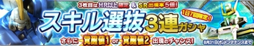 スキル習得に人気の機体を集めたガ「スキル選抜3連ガシャ」が1日7回限定で登場。1から2枚目はSR・HR出現率3倍、3枚目はHR以上確定かつSR出現率5倍。さらに、「覚醒値1」または「覚醒値2」で出現のチャンス。