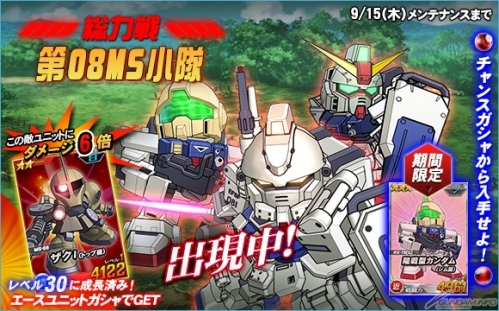 総力戦に「第08MS小隊」が、エースユニットガシャに「★3 陸戦型ガンダム」などが登場。特殊任務「オペレーションチップ奪還作戦」と「潜入ミッションイベント」の同時開催に加え、ユニット合成経験値アップ期間、ログインボーナスキャンペーンもスタート。