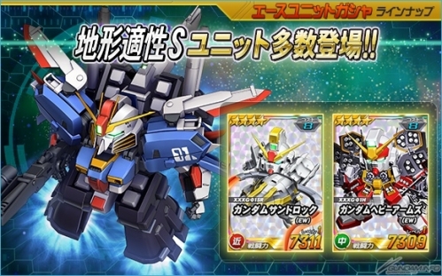 エースユニットガシャラインナップ更新で、「★4 Sガンダム(ブースター・ユニット装着型)」などがラインナップ。超総力戦は「第08MS小隊」で、チャンスガシャSに「★3 ガンダムEz8」などが登場。★3以上の「地形適正Sユニット」の確率がアップする「『地形適正Sユニット』確率アップキャンペーン」開催。