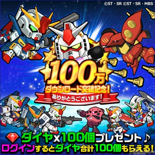 เนื่องในโอกาสที่เกมทำยอดดาวน์โหลดมากกว่า 1,000,000 ก๊อปปี้ ทางเกมได้จัดกิจกรรม Login Bonus พิเศษที่จะแจก เพชร 100 เม็ด และ Stamina 60 ชิ้น ตั้งแต่วันนี้เป็นต้นไป พร้อมกับอีเว้นต์ “จู่โจม Psycho Gundam!” ที่แจกตัว Super 3 ดาว และเพชรมากมาย และแจกสติกเกอร์ไลน์ถึงวันพุธที่ 28 กันยายน นี้