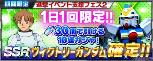 豪華特典盛りだくさんの「TGS2016開催記念3連ガシャ」登場。「東京ゲームショウ2016」での「ガンダムゲーム30周年スペシャルステージ」開催を記念して「SR アムロ・レイ」、「SR ガンダム」、アピールタグ「アムロ、いきまーす」がプレゼントされる「TGS2016 特別ログインボーナス」も。