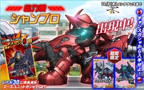 本日より総力戦「シャンブロ」がスタート。チャンスガシャから獲得できるユニットに、「★3 スラッシュザクファントム(イザーク専用機)」、「★3 ブルーディスティニー2号機」、「★3 ギャプラン(MS)」が復刻。エースユニットガシャラインナップが更新され、「★3 クラーケ・ズール」が登場。