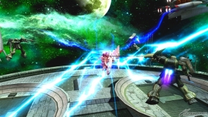 ▲バーストアタック「俺はニュータイプだ!」は、格闘攻撃で突き飛ばした敵を3体のギラ・ドーガがワイヤーを使って拘束し、敵頭上からヤクト・ドーガがビーム・サーベルでフィニッシュを決める。