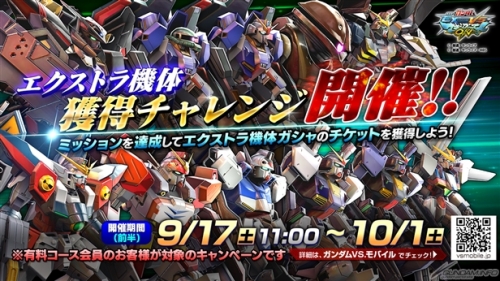連動サイト「ガンダムVS.モバイル」の有料会員限定「エクストラ機体獲得チャレンジ」が前後半に渡り開催中だ。期間中に「エクストラミッション」を達成すると、専用の「機体ガシャチケット」を獲得でき、このチケットを使用することで、ランダムでエクストラ機体を入手できる。手に入る機体は開催期間により異なるので、目当ての機体を必ず確認しておこう。詳細は 「ガンダムVS.モバイル」をご覧ください。