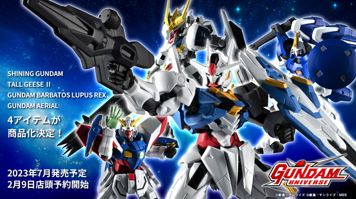 รอบล่าสุดของ GUNDAM UNIVERSE ซีรีย์ที่พัฒนาโดย Tamashii Nations ประกอบด้วย Gundam Aerial, Shining Gundam, Gundam Barbatos Lupus Rex, และ Tallgeese II โดยจะวางจำหน่ายในเดือนกรกฎาคม