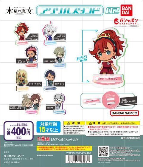 กาชาปอง Mobile Suit Gundam THE WITCH FROM MERCURY Acrylic Stands 02 จะวางจำหน่ายที่เครื่องจำหน่ายกาชาปองทั่วประเทศญี่ปุ่น เริ่มในสัปดาห์ที่ 4 เดือนมีนาคม แต่ละชิ้นราคา 400 เยน (รวมภาษี)