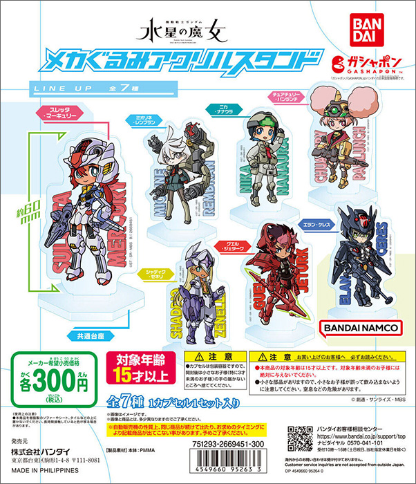สินค้ากาชาปอง Mobile Suit Gundam THE WITCH FROM MERCURY Mecha-gurumi Acrylic Stands จะวางจำหน่ายที่เครื่องจำหน่ายกาชาปองทั่วประเทศญี่ปุ่นในสัปดาห์ที่ 4 ของเดือนเมษายน ราคา 300 เยน (รวมภาษี) ต่อครั้ง