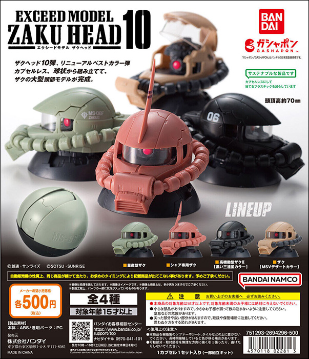 ในสัปดาห์ที่ 3 ของเดือนพฤศจิกายน ZAKU HEAD 10 จะเข้าร่วมซีรีส์ EXCEED MODEL ซึ่งมีรายละเอียดโมเดลของหัวโมบิลสูทที่ประกอบจากฟอร์มแคปซูลกาชาปองทรงกลม จะวางจำหน่ายจากเครื่องขายกาชาปองทั่วญี่ปุ่น และการเล่นแต่ละครั้งมีค่าใช้จ่าย 500 เยน (รวมภาษี)