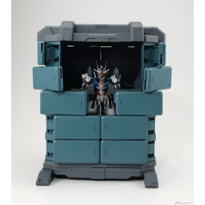 ชุดอุปกรณ์กึ่งประกอบเหมาะสำหรับผู้เริ่มต้นที่ประกอบได้ง่าย ช่วยให้สามารถจำลองแนวคิดดั้งเดิมได้อย่างสมจริง โมบิลสูทต่างๆ รวมถึงโมเดล GUNPLA ที่จำหน่ายแยกต่างหาก เช่น HG Gundam Aerial และ HG Dilanza สามารถเก็บไว้ในคอนเทนเนอร์ได้ ช่องด้านหน้ามีกลไกการเลื่อนและเปิดที่เหมือนจริงสำหรับแต่ละชิ้นส่วน ในขณะที่แขนภายในสามารถเคลื่อนย้ายได้ และช่องหลักสามารถหมุนเพื่อเปลี่ยนทิศทางที่เปิดได้