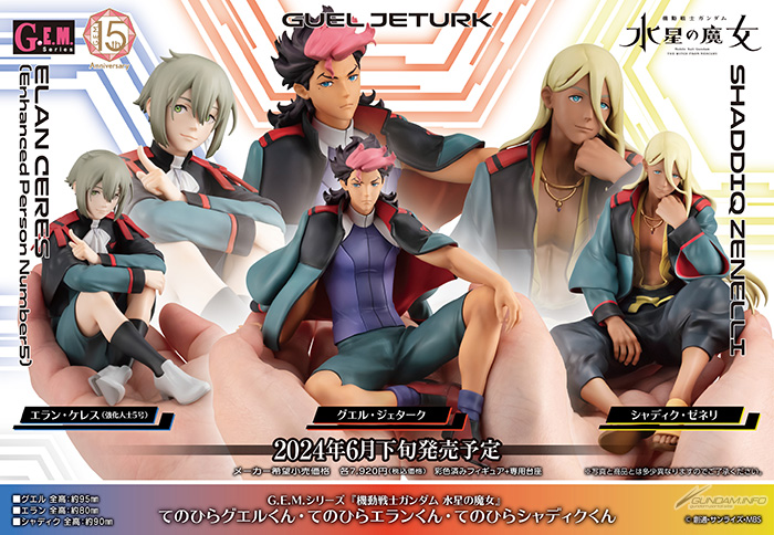 G.E.M. Series Mobile Suit Gundam THE WITCH FROM MERCURY Guel, Elan, และ Shaddiq ในขนาดเท่าฝ่ามือจะวางจำหน่ายจาก MegaHouse ปลายเดือนมิถุนายน ฟิกเกอร์มีราคาชิ้นละ 7,920 เยน (รวมภาษี)