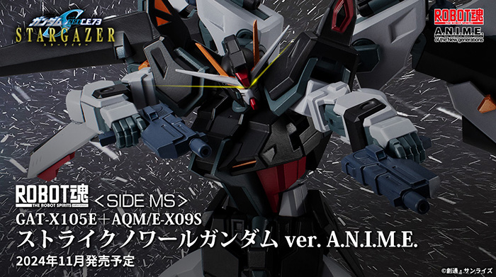 Strike Noir โมบิลสูทที่ขับโดย Sven Cal Bayang ใน Mobile Suit Gundam SEED C.E.73 STARGAZER เข้าร่วมซีรีส์ ver. A.N.I.M.E. เนื่องจากโมบิลสูทนั้นได้รับแรงบันดาลใจมาจาก Strike Gundam จึงใช้ชิ้นส่วนบางส่วนร่วมกับ ROBOT SPIRITS Strike Gundam อาวุธพิเศษของ Noir Striker ที่อยู่ด้านหลังสามารถกางออกให้มีลักษณะคล้ายปีกได้ ปืนเรลกันสามารถเคลื่อนย้ายจากฐานได้ และปากกระบอกปืนสามารถชี้ไปข้างหน้าได้ ส่วนลำแสงใสสามารถติดเข้ากับใบพัดลำแสงได้ ส่วนปีกหลักเชื่อมต่อกับบล็อกตรงกลางด้วยแขนรูปข้อเหวี่ยง ทำให้สามารถขยับได้หลายทิศทาง และเพลิดเพลินกับท่าทางที่ฉูดฉาดได้