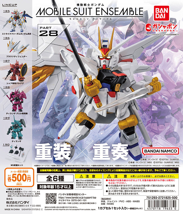 MOBILE SUIT ENSEMBLE รอบที่ 28 ซึ่งเป็นซีรีส์กาชาปองที่มีธีมเกี่ยวกับรูปร่างที่เปลี่ยนแปลงไปตามอาวุธ ได้วางจำหน่ายแล้ว โดยในรอบนี้จะมีทั้งหมด 6 เซ็ต ได้แก่ Strike Freedom Gundam Type II และ Proud Defender จาก Mobile Suit Gundam SEED FREEDOM, Char’s Gelgoog จาก Mobile Suit Gundam, Dilanza และ Guel’s Dilanza จาก Mobile Suit Gundam THE WITCH FROM MERCURY และ MS Weapon Set