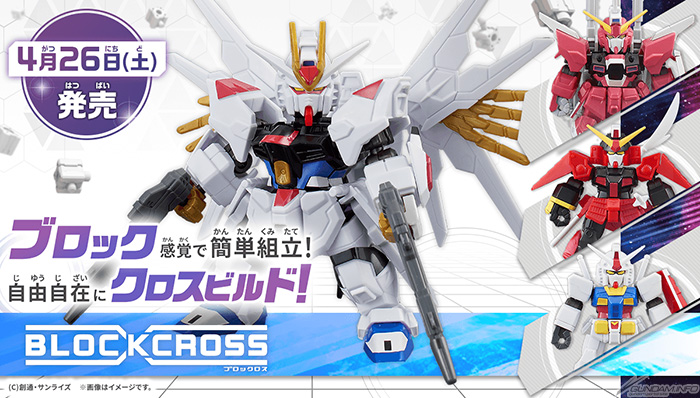 BLOCKCROSS เป็นซีรีส์ฟิกเกอร์ใหม่ที่พัฒนาโดย Bandai และรอบแรกที่นำเสนอซีรีส์กันดั้ม (มีฟิกเกอร์ 4 แบบ) จะวางจำหน่ายในวันเสาร์ที่ 26 เมษายน โดยจะวางจำหน่ายที่ร้านขายของเล่น ห้างสรรพสินค้า ร้านขายเครื่องใช้ไฟฟ้า ร้านค้าออนไลน์ และสถานที่อื่นๆ ทั่วญี่ปุ่น โดยฟิกเกอร์แต่ละตัวจะวางจำหน่ายในราคา 1,870 เยน (รวมภาษี)