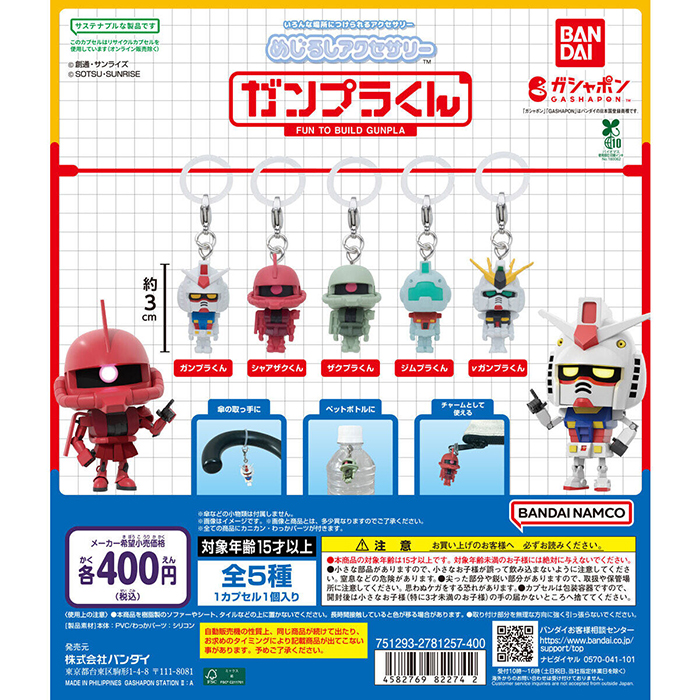มีให้เลือก 5 แบบ ได้แก่ GUNPLA-Kun, CHARZAKU-Kun, ZAKUPLA-Kun, GMPLA-Kun และ vGUNPLA-KunThese items can be attached to umbrella handles, plastic bottles, or used as a charm!