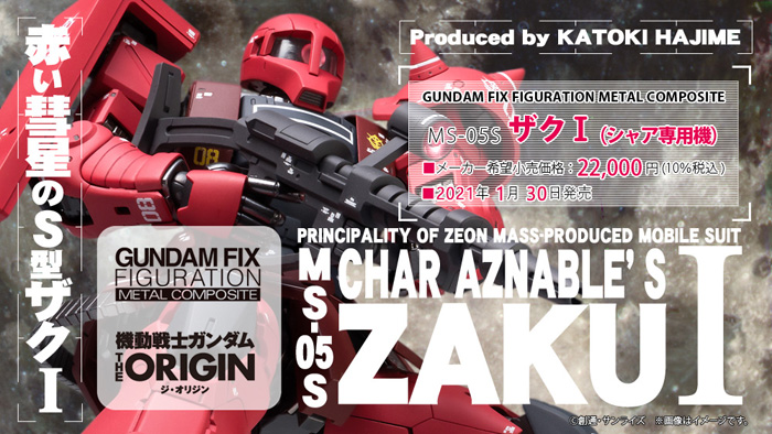 MS-05S Char’s Zaku I วางจำหน่ายแล้ววันนี้ เสาร์ที่ 30 มกราคม 2021 จาก GUNDAM FIX FIGURATION METAL COMPOSITE (G.F.F.M.C) ชุดซีรีย์โมเดลสำเร็จรูปที่ใช้วัสดุ die-cast และ ABS ในราคา 22,000 เยน (รวมภาษี)