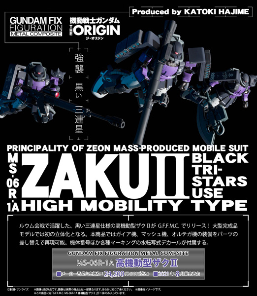ชุด Zaku II High Mobility Types ที่ปรากฎตัวใน Mobile Suit Gundam: THE ORIGIN ที่ขับโดย Gaia Ortega และ Mash หรือเป็นที่รู้จักในนาม Black Tristars จะวางจำหน่ายเป็นครั้งแรกในแบบโมเดลประกอบสำเร็จที่ได้รับการดูแลโดย Hajime Katoki