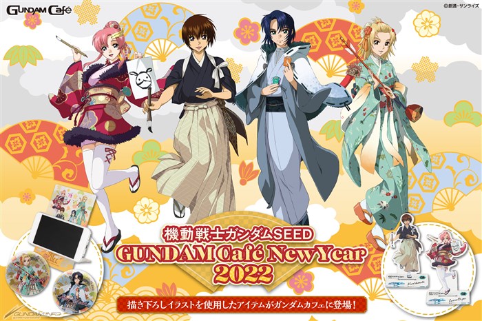 GUNDAM Café NEW YEAR 2022 เป็นงานแฟร์ที่คุณสามารถเฉลิมฉลองปีใหม่ไปกับคาแรคเตอร์ทั้งสี่จาก Mobile Suit Gundam SEED: Kira Yamato, Athrun Zala, Cagalli Yula Athha และ Lacus Clyne