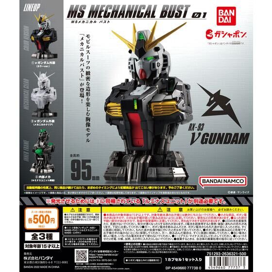 แบรนด์กาชาปองใหม่ Mobile Suit Gundam MS Mechanical Bust มาแล้ว ในรอบแรกนำเสนอ ν Gundam วางจำหน่ายวีคที่ห้าของเดือนกันยายน ในราคาบิดละ 500 เยน (รวมภาษี) ณ เครื่องจำหน่ายกาชาหยอดเหรียญ
