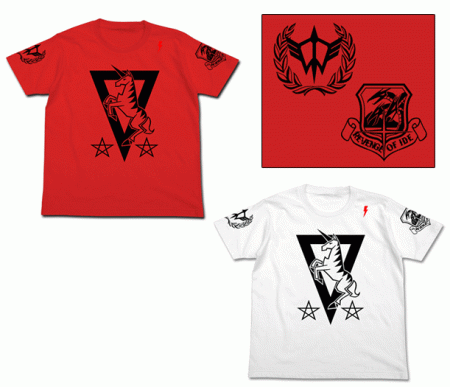 The front features his personal insignia and a casual lightning print, while the sleeves are marked with the insignia of his corps and the One Year War's feared Chimera Squadron. With this T-shirt, you too can be the Crimson Lightning!