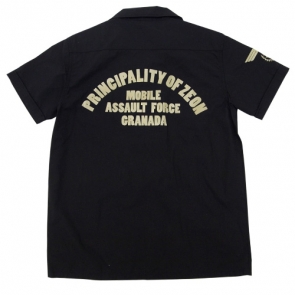 「ジオン突撃機動軍ワークシャツ」は、黒い三連星などが所属する突撃機動軍仕様のワークシャツで、その本部であるグラナダの配給品をイメージしたデザインとなっている。