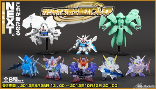 Gashapon Senshi NEXT Premiere features an amazing lineup of mobile suits like the Dendrobium (120mm long) and Neue Ziel (90mm high) simply too big to fit in a Gashapon capsule, plus clear versions of old favorites.