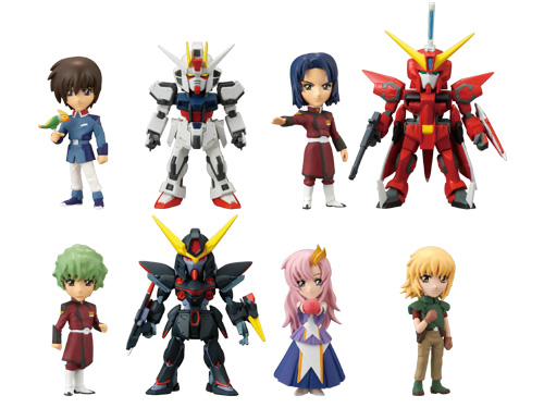 The first set from the World Collectable Figure series includes Mobile Suit Gundam SEED's Kira Yamato and his Strike Gundam, Athrun Zala and his Aegis Gundam, Nicol Amalfi and his Blitz Gundam, plus Cagalli Yula Athha and Lacus Clyne.