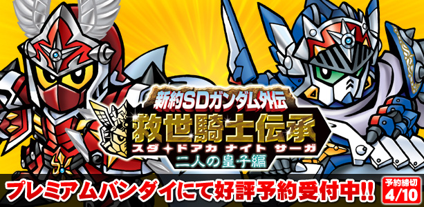 新約SDガンダム外伝 救世騎士伝承 スダ・ドアカ・ナイト・サーガ 二人の皇子編 価 格 : 7,140円(税込)(送料・手数料別途) 予約受付: 2013年4月10日(水)16:00まで 商品発送: 2013年5月予定 |