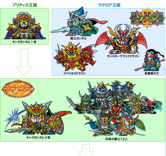 「騎士ガンダムシリーズ」の新たな歴史の幕開けとなり、往年のファンにとっては待望の新ストーリーとなるわけだが、今回は「ブリティス王国?」「円卓の騎士?」という、そもそもシリーズのことをよく知らない人のために、まずは 旧シリーズからの系譜を簡単に紹介していこう。