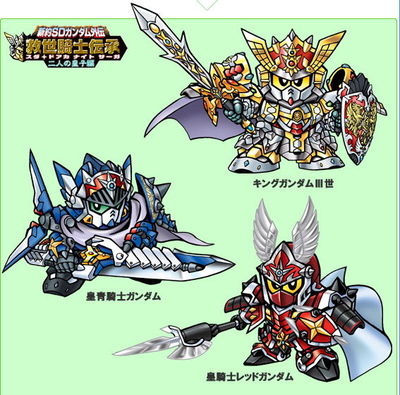 しかし今回の『新約SDガンダム外伝 救世騎士伝承 スダ・ドアカ・ナイト・サーガ 二人の皇子編』は、 「機動戦士ガンダムUC」や 「機動戦士ガンダムSEED」といった最新ガンダム作品からの、 完全新規設定の新キャラが続々と登場するので、これからの人でも充分楽しむことができる。