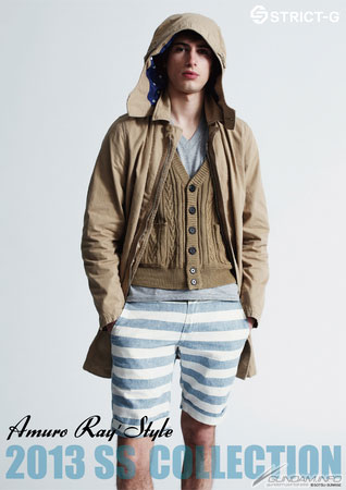 Here, it's seen coordinated with a cotton-hemp cardigan in mustard, the color of Amuro's turtleneck. The bottoms, border pants in a vintage-style cotton reminiscent of Amuro's trunks, give off a rough and tough, manly image.