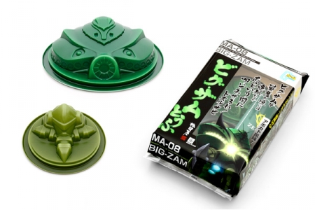 「ビグ・ザムとうふ」は、ジオン公国軍の試作MA「ビグ・ザム」の胴体部と脚部をモチーフとした容器に、「アボガド風味」と「プレーン」の2種類の豆腐を充填した商品で、取扱い説明書、型抜き用のご飯カップとともに専用箱に梱包された業界初の「組み立てるおとうふ」。