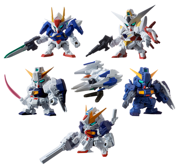 The newest Gashapon Senshi NEXT, evolving SD Gundam proportion, action, and coloring, have arrived! This set includes Mobile Suit Gundam 00's 00 Gundam, 0 Raiser, and Reborns Gundam.