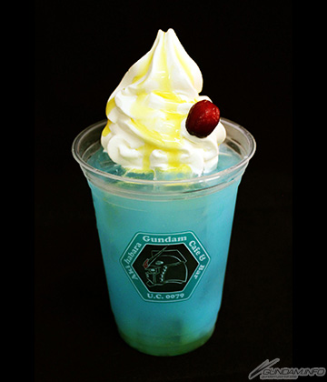 「MEMORY OF EDENフロート」は、カルピス風味の爽やかなドリンクに、濃厚なバニラソフトクリームをフロートし、主人公「アセム・アスノ」をイメージした金色のマンゴーシロップと、ライバルの「ゼハート・ガレット」をイメージした赤いクランベリーがトッピングされている。