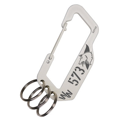 “白狼”シン・マツナガのパーソナルマークや機体番号、機体マーキングがプリントされた「シン・マツナガカラビナ」は、毎日使うカギ類や小物、ミニツール、ストラップなど、色々なものを取り付けることができる。実用性に加えてファッションのアクセントとしても活躍する一品。