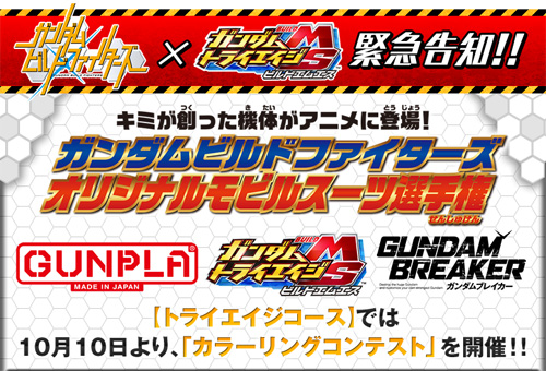 さらに、10月7日(月)より放送予定のTVシリーズ最新作『ガンダムビルドファイターズ』との連動企画「ガンダムビルドファイターズ オリジナルモビルスーツ選手権」のひとつとして、「ガンダムトライエイジ」では、優秀作品がアニメに登場する「カラーリングコンテスト」が10月10日(木)より実施されるぞ!