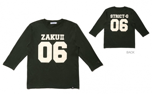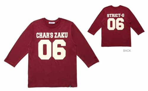今期のトレンドの七分袖のフットボールTシャツ。ナンバリングプリントをモビルスーツの機体ナンバーで大胆にレイアウト。左袖口には、それぞれ連邦軍、ジオン軍のエンブレム刺繍入り。
