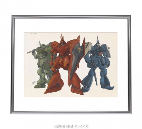 電撃B-magazine1999年3月号(メディアワークス刊)に掲載されたイラストレーション。『機動戦士ガンダム 逆襲のシャア』に搭乗したネオ・ジオンのモビルスーツ3体。出渕 裕がどのような配色を考えてこれらのメカニックをデザインしたのか、深く伝わってきます。複製原画では、原画にあるサザビーの深い赤色、ヤクト・ドーガのトーンを落とした青色、ギラ・ドーガの緑色を完全に再現しました。その色合いの妙をお楽しみください。