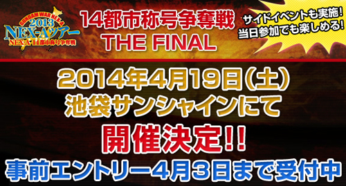 昨年6月より全国14都市と香港・台湾で開催されてきたトレーディングカードゲーム「ガンダムウォーネグザ」の公式大会「NEX-Aツアー2013」。その決勝大会となる「14都市称号争奪戦 THE FINAL」が、4月19日(土)に東京・池袋サンシャインシティで開催されることが決定した。