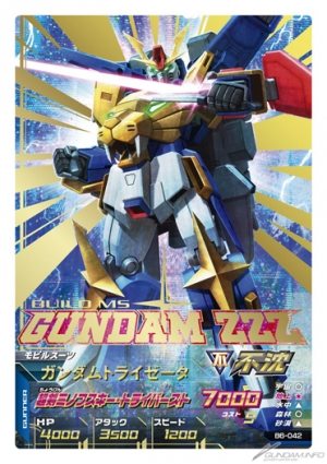 これまで「BUILD MS 4弾」トーナメントの優勝賞品として登場していた、トライエイジオリジナル機体「ガンダムトライゼータ」がパーフェクトレアとして収録される。