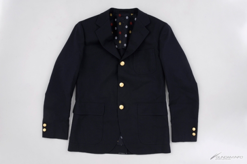 段返りの3つボタンタイプのジャケットは、連邦軍のマークが刻印された金ボタンを中央と襟につけ、高級感あふれるデザインながら、カラフルな総柄の裏地と袖部分のストライプの裏地がポイント。ウールの軽い素材で着心地がよく、裏地は背中の上側部分のみのため通気性に優れ、夏でもさらっと羽織ることができる。