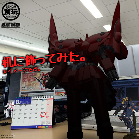 圧倒的な可動を誇る、台座付き彩色済みフィギュアが付属する食玩シリーズ「ASSAULT KINGDOM」。本アイテムでは、約400mmという超大型サイズで立体化された「ネオ・ジオング」のフィギュアが付くことになる。果たして机の上に飾ることはできるのか?!このサイズでも、ガムは付属するのか?!
