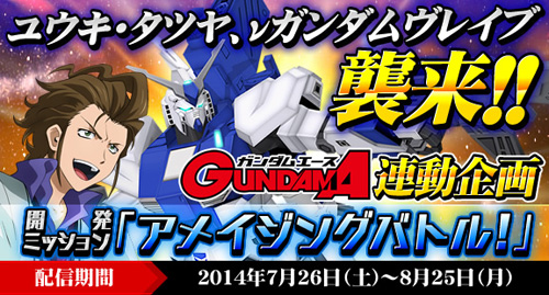 ミッションでは、月刊ガンダムエースにて好評連載中の「ガンダムビルドファイターズA」に登場するユウキ・タツヤのガンプラ「νガンダムヴレイブ」が襲来。見事ミッションをクリアすると同機体をビルドMSとして開発できるようになる。