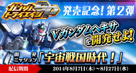 ミッションは、3DS「ガンダムトライエイジSP」発売記念の第2弾として配信されるもので、『機動戦士Vガンダム』より「Vガンダムヘキサ」、「ゾロ(クロノクル専用機)」、「ゾロ」の3機が襲来。見事ミッションをクリアすると「Vガンダムヘキサ」をビルドMSとして開発できるようになる。